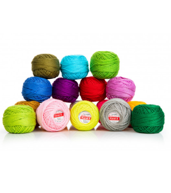 KARAT 8 is a shiny cotton thread, recommended for hand embroidery, crocheting and other handwork. It is ideal for flat embroidery, decorative seams and joining elements. Shiny thread gives an elegant look to embroidery or lace. Available in 55 colors.