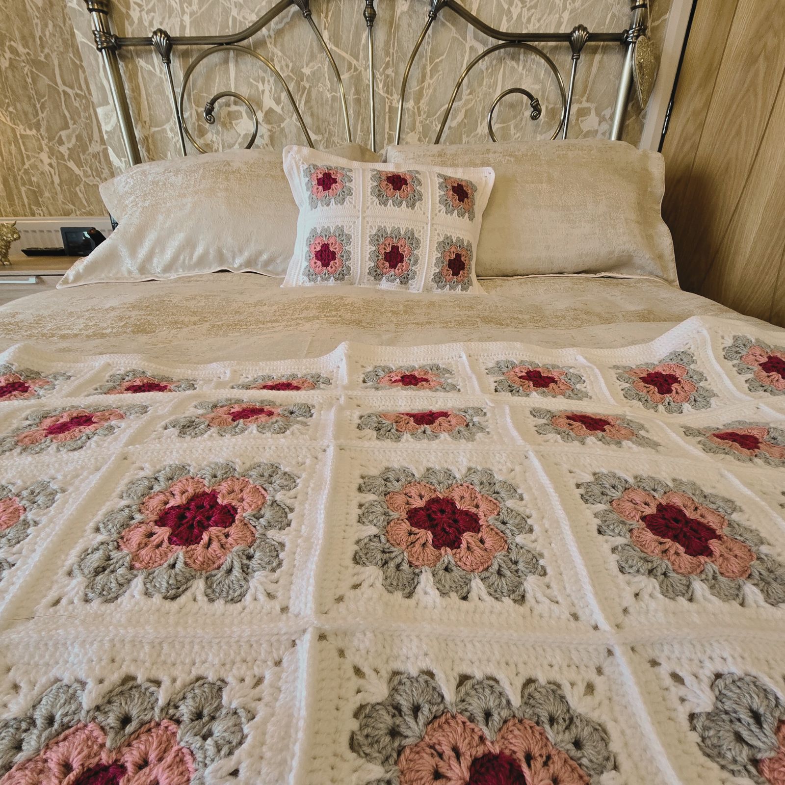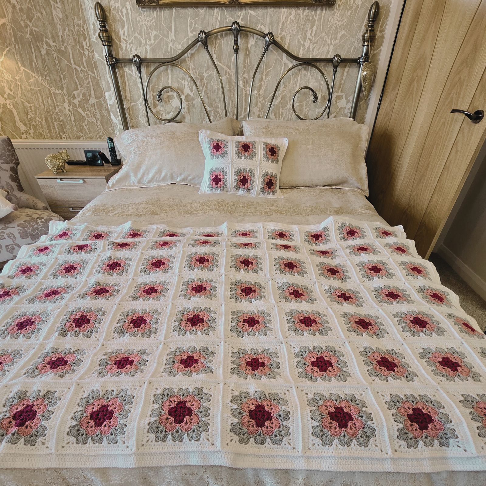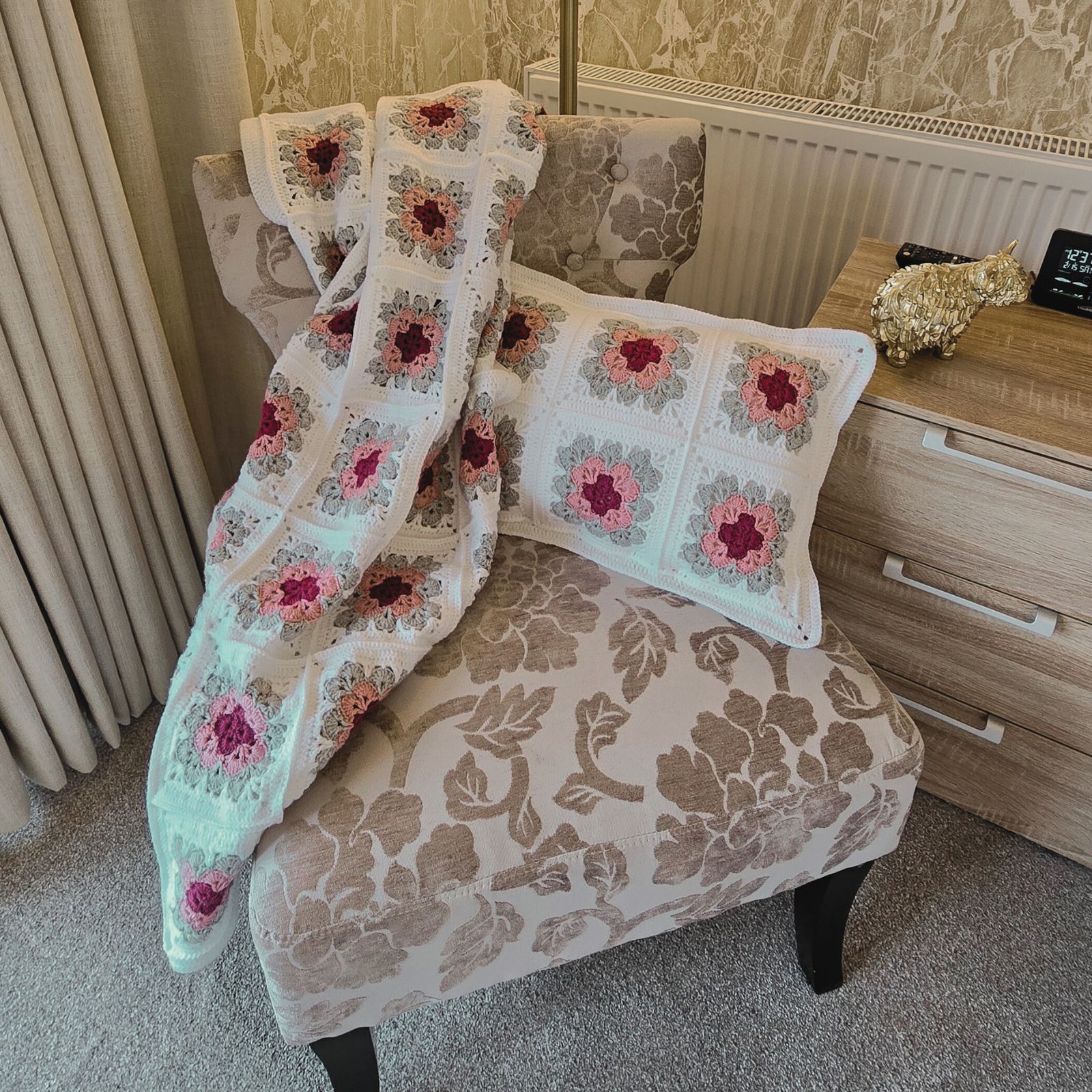 Add a touch of vintage charm to your home with this beautiful handmade crochet blanket and matching pillow. Designed with a soft, romantic look, this set perfectly complements Shabby Chic, Country Life, or Cottage Style interiors.