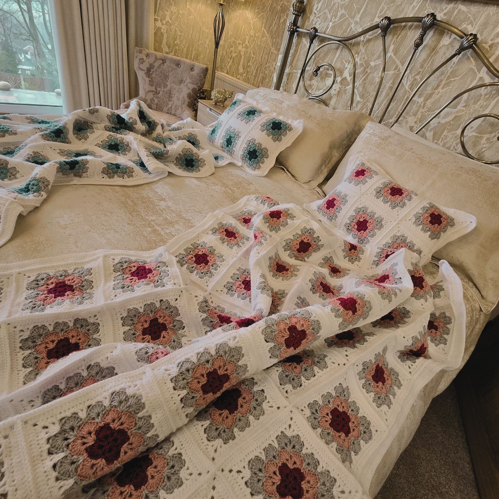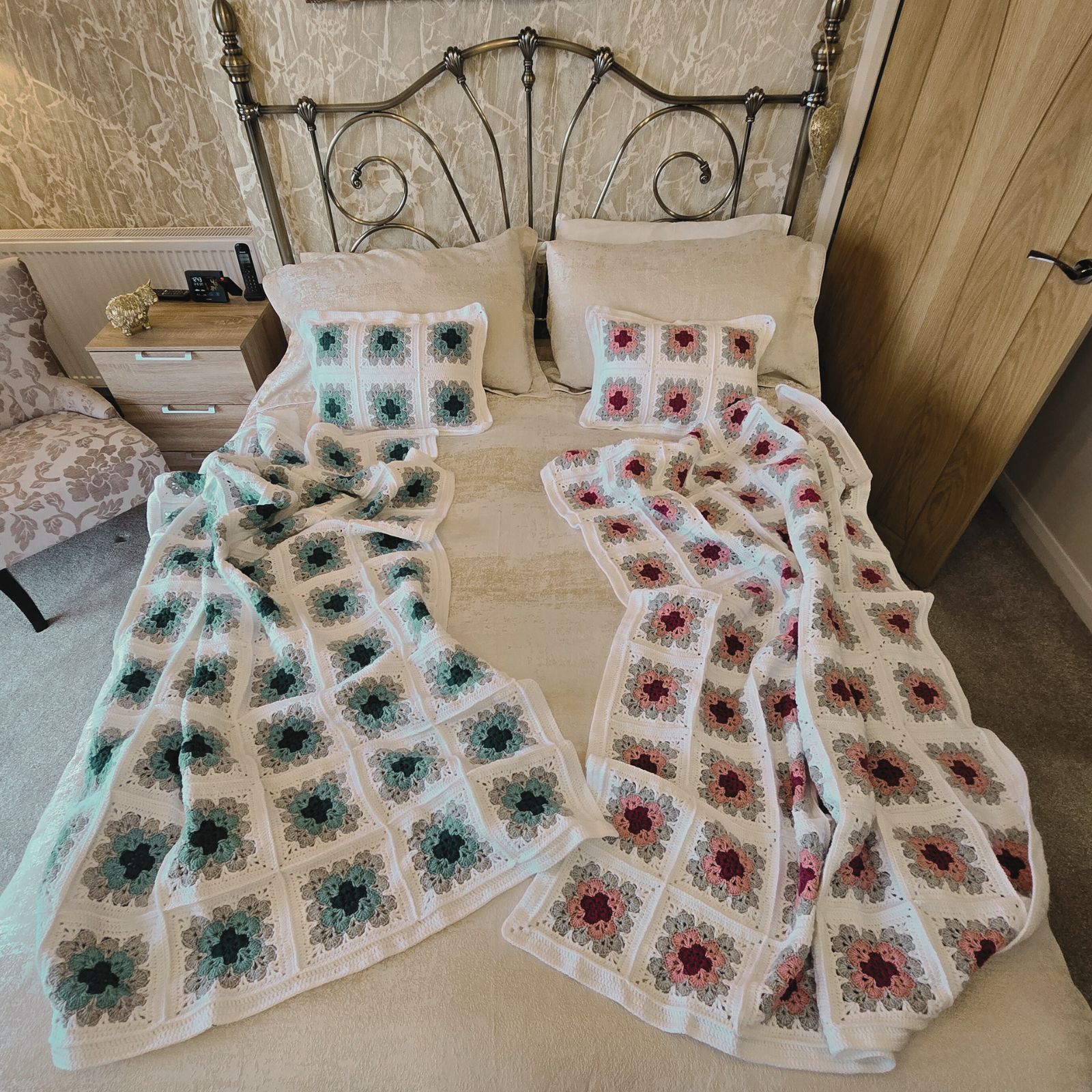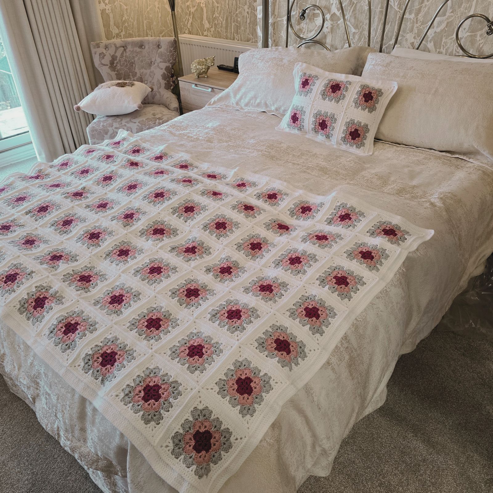 Add a touch of vintage charm to your home with this beautiful handmade crochet blanket and matching pillow. Designed with a soft, romantic look, this set perfectly complements Shabby Chic, Country Life, or Cottage Style interiors.