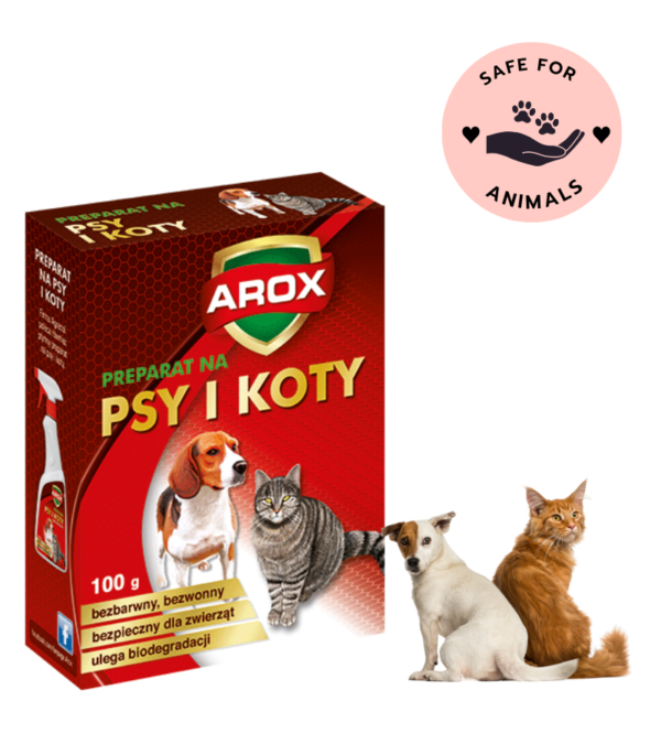 The product repellent for dogs and cats is a specially prepared formula of an easily biodegradable repellant that causes disorientation of the senses of dogs and cats. The substance is safe for animals and in terms of health is indifferent to them.