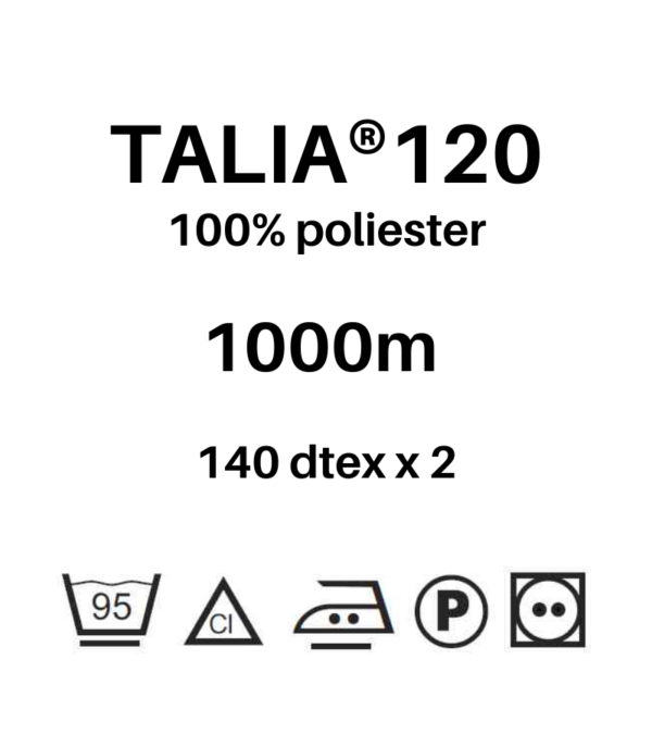 TALIA 120 – to specjalistyczne nici odzieżowe wykonane w 100% z poliestrowych włókien staplowych, zaprojektowane tak, aby speÅ‚nić wszystkie oczekiwania jakoÅ›ciowe użytkownika. Optymalny dobór parametrów fizyko-mechanicznych zapewnia bardzo dobre wÅ‚aÅ›ciwoÅ›ci szycia nici, oraz doskonałą trwaÅ‚ość szytych nimi produktów. Kolory sÄ… odporne na Å›wiatÅ‚o, pranie i czynniki chemiczne.