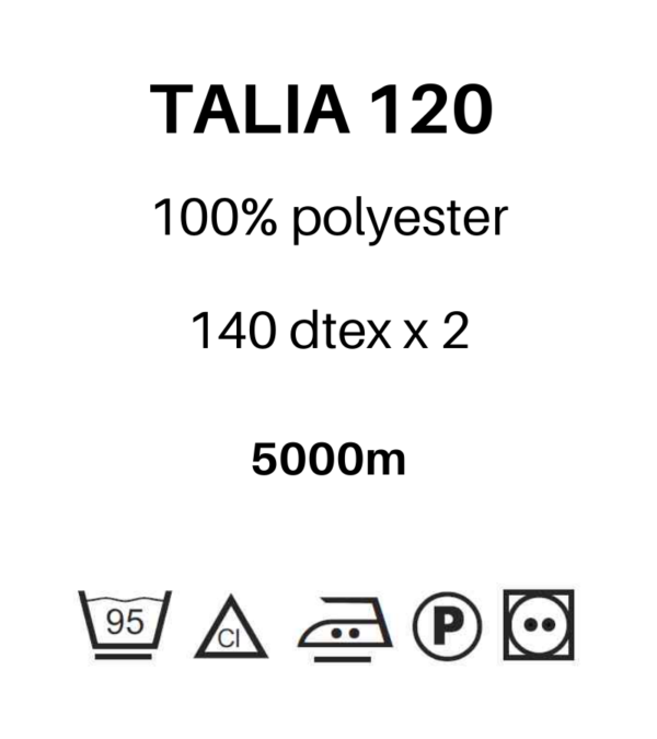 TALIA 120 – to specjalistyczne nici odzieżowe wykonane w 100% z poliestrowych włókien staplowych, zaprojektowane tak, aby speÅ‚nić wszystkie oczekiwania jakoÅ›ciowe użytkownika. Optymalny dobór parametrów fizyko-mechanicznych zapewnia bardzo dobre wÅ‚aÅ›ciwoÅ›ci szycia nici, oraz doskonałą trwaÅ‚ość szytych nimi produktów. Kolory sÄ… odporne na Å›wiatÅ‚o, pranie i czynniki chemiczne.