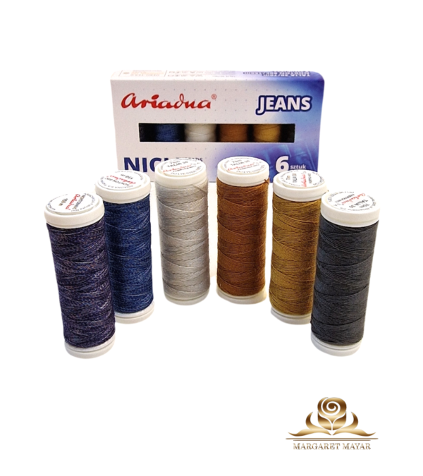 Zestaw do szycia jeansu zawiera 4 szpule nici Talia 30/70m oraz 2 szpule nici Nokton 80C/150m.