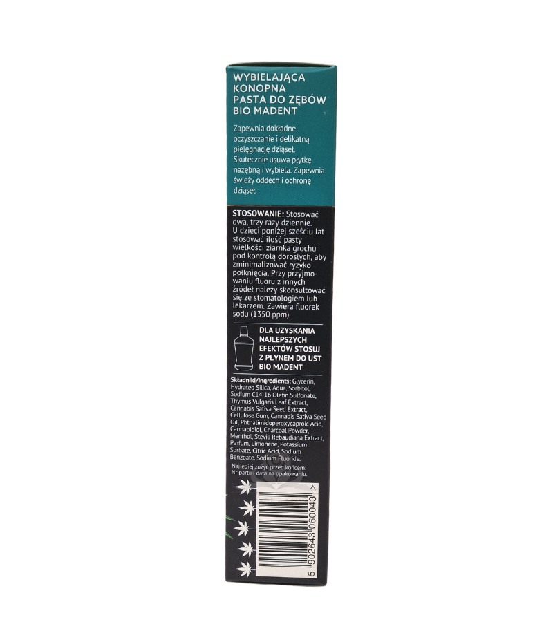 Gliceryna, uwodniona krzemionka, wodny sorbitol, sulfonian sodu C14-16, ekstrakt z liści tymianku pospolitego, ekstrakt z nasion konopi indyjskich, guma celulozowa, olej z nasion konopi indyjskich, kwas ftalimidoperoksykapronowy, proszek z węgla drzewnego kannabidiolu, mentol, stevia rebaudiana, ekstrakt z sorbinianu potasu, cytrynowy kwas, benzoesan sodu, fluorek sodu.